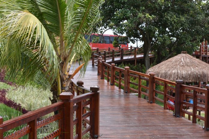 A estrutura foi toda construída em madeira e tem duas choupanas, bancos, além de iluminação com mais de 200 refletores em led.