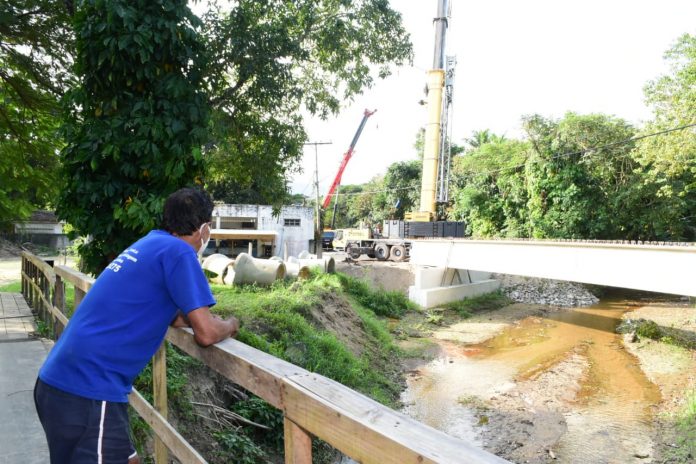 O trabalho de construção da estrutura de concreto que sustenta as vigas, nas duas margens do rio, começou há cerca de cinco meses e envolveu a demolição de uma ponte improvisada pelos moradores, além da instalação de uma ponte provisória de madeira –tanto esta quanto a anterior, no entanto, não suportavam veículos de passeio ou de carga.