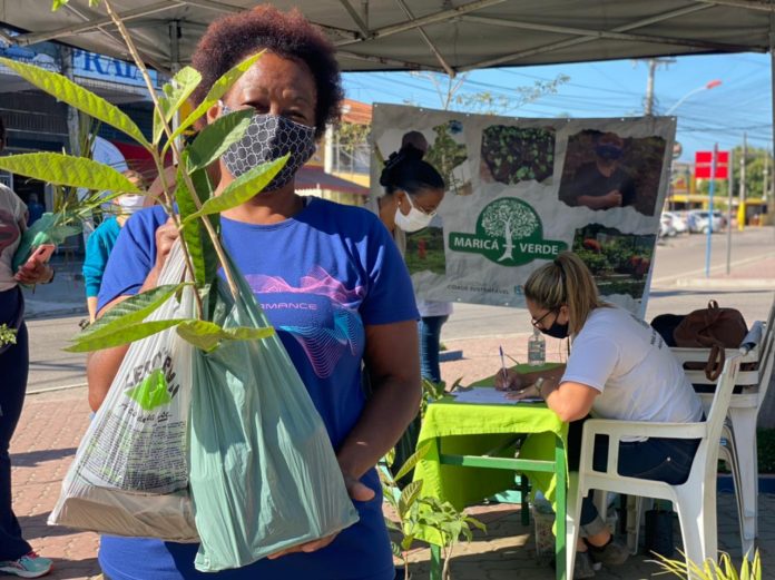 Na praça do bairro, o Maricá+Verde, iniciativa da Secretaria de Cidade Sustentável, distribuiu 100 plantas nativas da Mata Atlântica, com grande movimentação de pessoas interessadas nas mudas de ipê-amarelo, ipê-rosa, palmeira-garrafa, moringa, algodão-da-praia, aroeira e capim-limão, além das frutíferas goiaba e capim-limão.